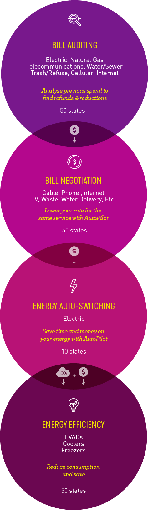 If you’re like most businesses, you could be overpaying lots of different ways. Maybe you are paying more than you should for basic services like Internet or phone. Or maybe you are not optimizing your energy consumption and rate. Or maybe your utility bills have errors, discrepancies and mistakes that you can correct and pay less. Regardless of WHY you are overpaying, the HOW to lower your bills is simple. Let us manage them for you!